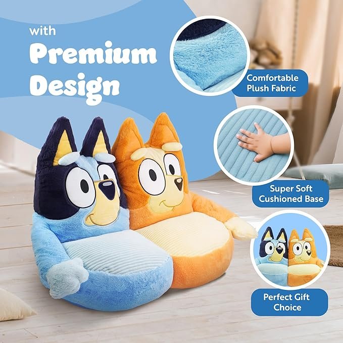 - SUPER-SOFT BLUEY & BINGO TODDLER SEAT – This plush kids’ sofa chair features adorable Bluey and Bingo characters, offering a cosy and comfortable spot for reading, relaxing or playtime. Made with ultra-soft plush fabric that’s gentle on sensitive skin.