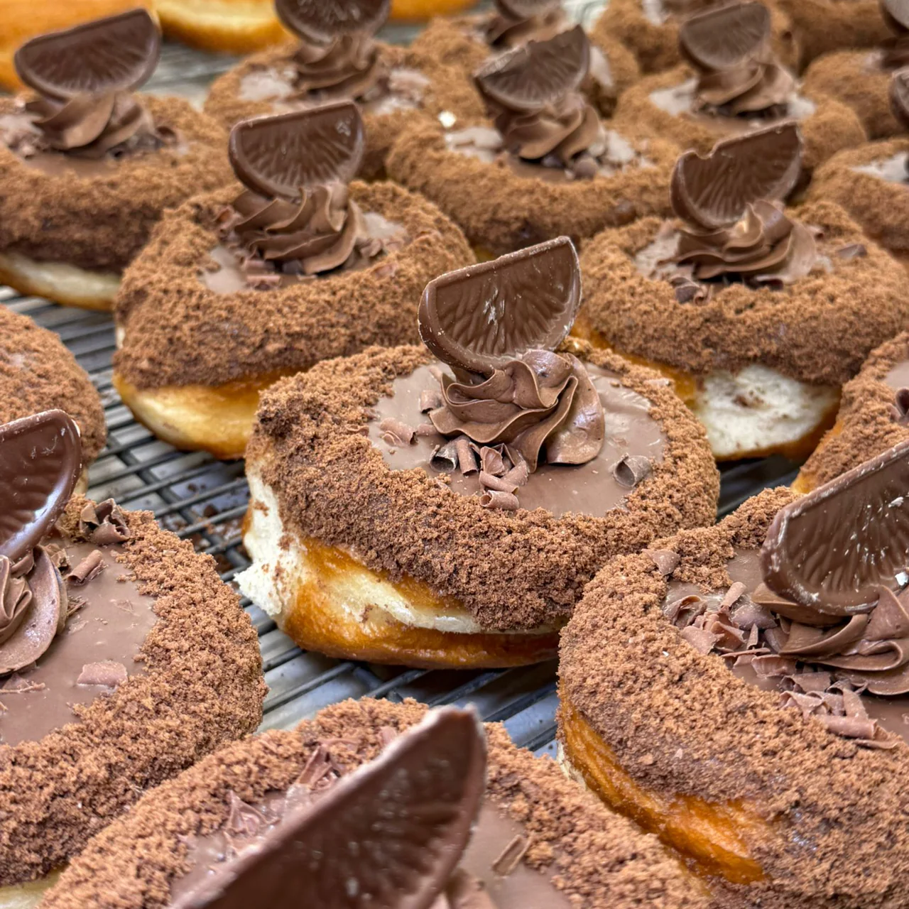 Puddle donut dunked in milk chocolate, topped with chocolate bourbon crumb, orange buttercream, gold glitter, and a slice of Terryโ€™s Chocolate Orange. A Christmas classic done the Doboy way.